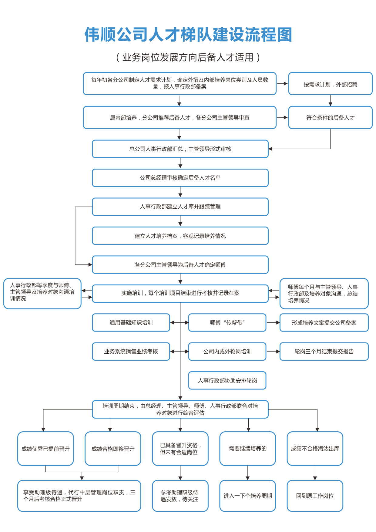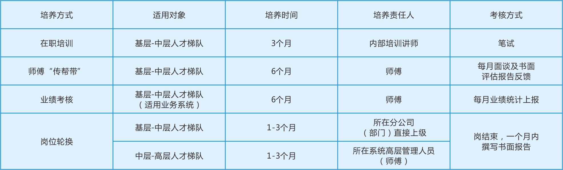 1、選有所用的原則。進入人才梯隊的人員,確定好是向業務崗位還是向管理崗位方向發展。 2、持續性原則。后備人才培養工作每年至少開展一次,確保公司發展有源源不斷的人才隊伍供給。 3、共同培養的原則。由總公司統籌,各分公司(部門)作為培養基地,共同搞好人才梯隊培養工作。 4、人才共享,推薦部門優先選用。推薦部門沒有任用的,公司可另行安排。返回