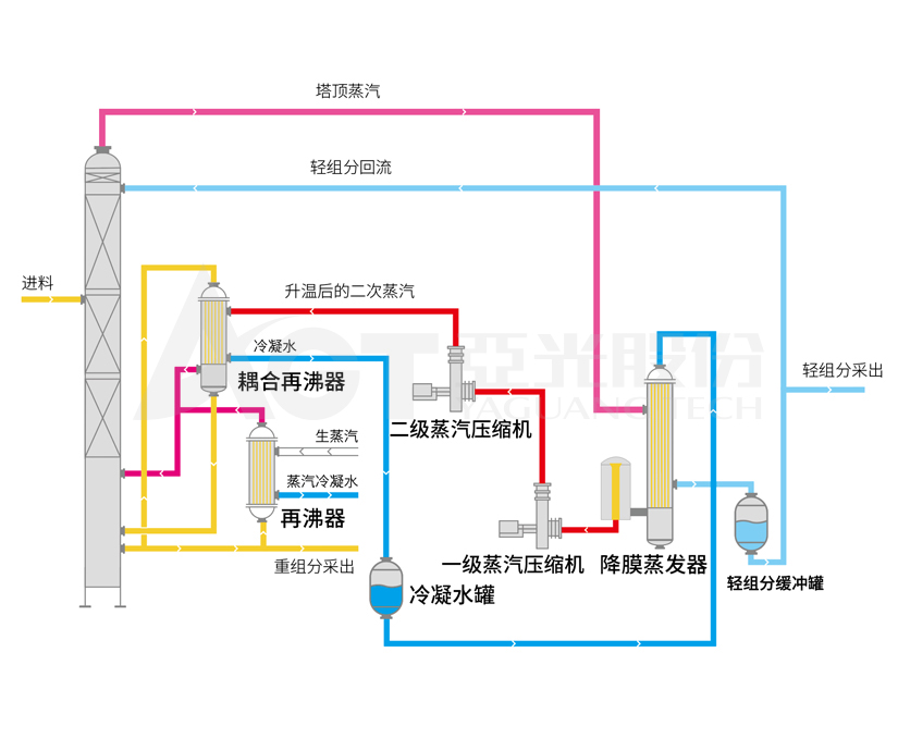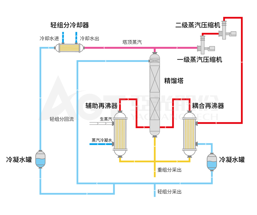 在傳統精餾塔系統中引入壓縮機,塔頂低溫低壓的蒸汽經壓縮機壓縮后變成高溫高壓氣體,然后經過再沸器作為熱源給物料加熱,通過再沸器被冷凝后的輕組分冷凝液,經過緩沖罐緩沖,再通過回流泵輸送,部分采出部分回流。