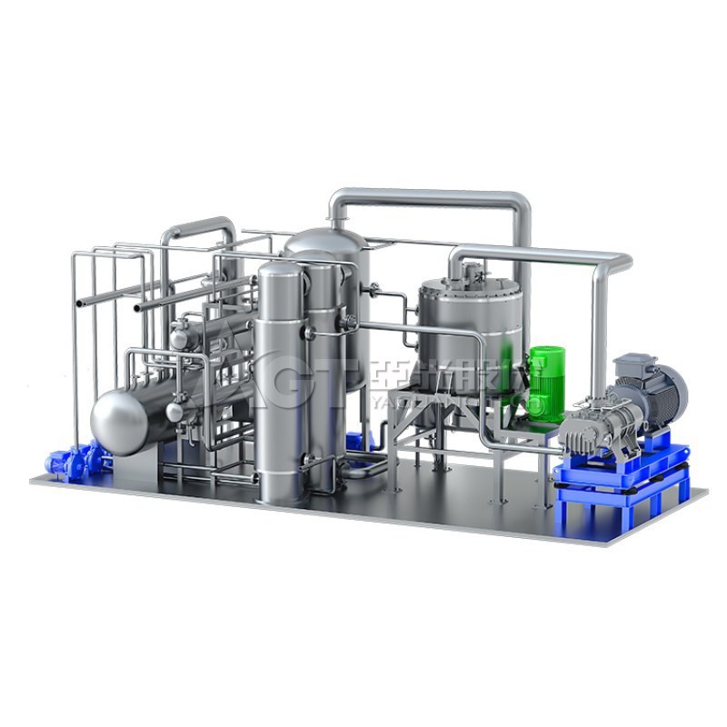 該系統(tǒng)以高效旋轉(zhuǎn)精餾床為基礎(chǔ),利用離心力場代替重力場,強化相與相之間的相對速度和相互接觸,通過強化傳質(zhì)傳熱來提高分離效率縮小設(shè)備體積。 通過在系統(tǒng)中引入適用于小流量、大壓比的螺桿式蒸汽壓縮機,即可實現(xiàn)MVR循環(huán)熱泵精餾。